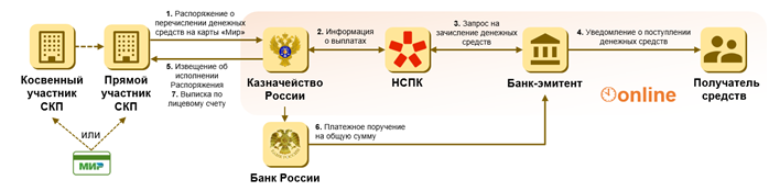 Сервис предусматривает взаимодействие Федерального казначейства с оператором платежной системы «Мир» (АО «Национальная система платежных карт») в режиме реального времени в целях обеспечения проверки действительности карт и моментального зачисления денежных средств с использованием лишь номера карты.