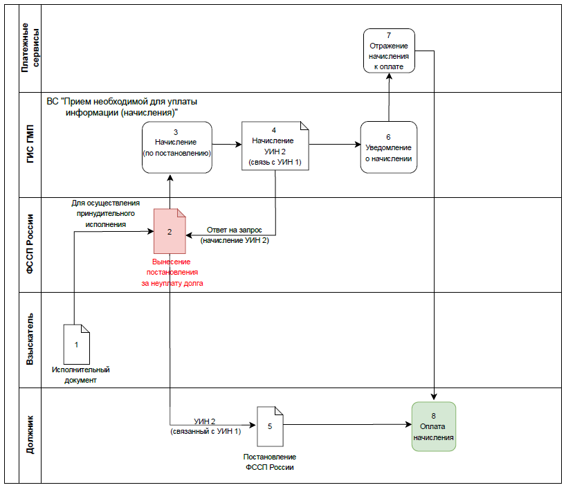 УИН 1 сформированного в ГИС ГМП начисления, присвоенный Взыскателем, используется ФССП России для перечисления по нему взысканных с Должника средств на счет Взыскателя. Первоначальное начисление (УИН 1) и начисление ФССП России (УИН 2), сформированные в ГИС ГМП, погашаются и скрываются из личных кабинетов Должника, на Порталах госуслуг и иных платежных сервисов.