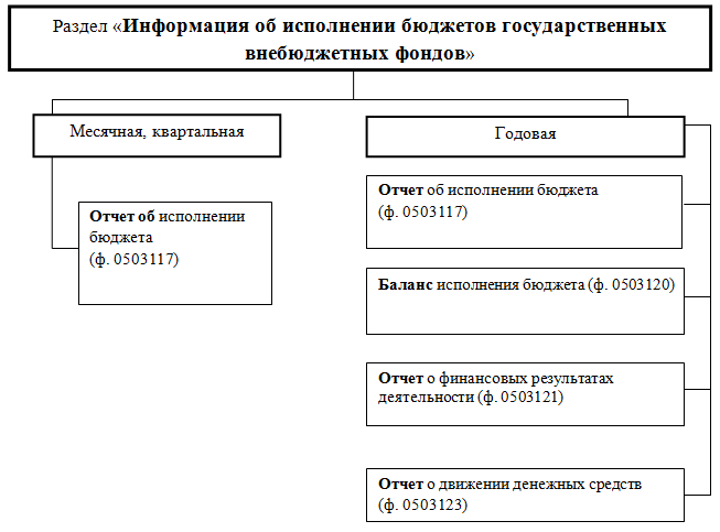 Отчет об исполнении бюджета (ф. 0503117) (месячный, квартальный, годовой) содержит данные об исполнении бюджетов государственных внебюджетных фондов Российской Федерации (Пенсионного фонда Российской Федерации, Фонда социального страхования Российской Федерации, Федерального фонда обязательного медицинского страхования) по доходам, расходам и источникам финансирования дефицита бюджета в соответствии с бюджетной классификацией Российской Федерации.