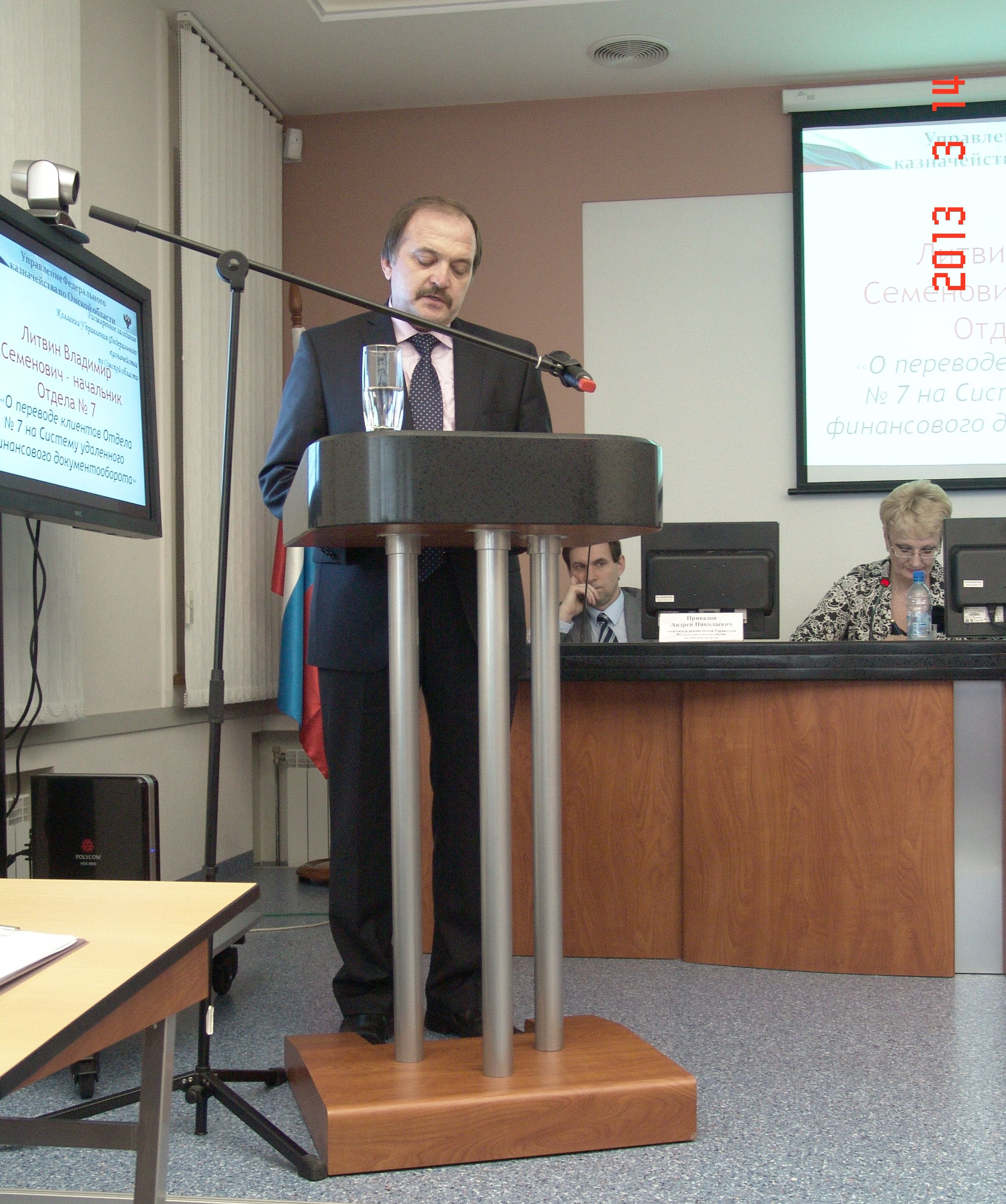 Также с докладами выступили заместители руководителя Управления и начальники отделов. Более подробно были затронуты вопросы совершенствования функциональной деятельности, а именно, вопросы клиент-ориентированного сервиса, вопросы перевода клиентов на СУФД-onlain.
