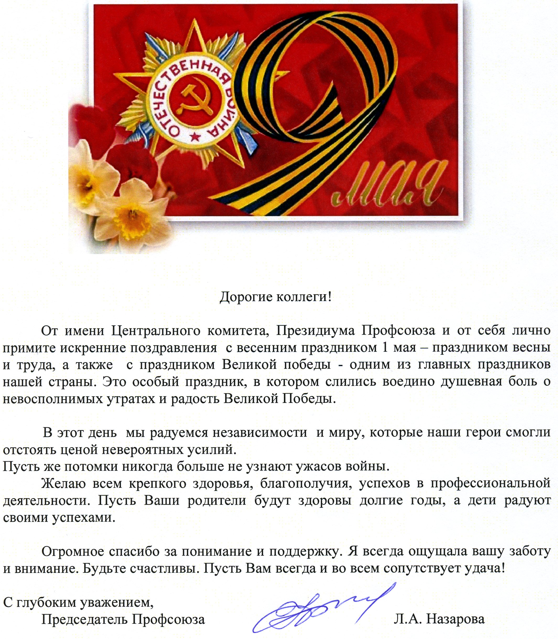 Поздравление Председателя Профсоюза Л.А. Назаровой с праздниками 1 мая и Днем Победы
