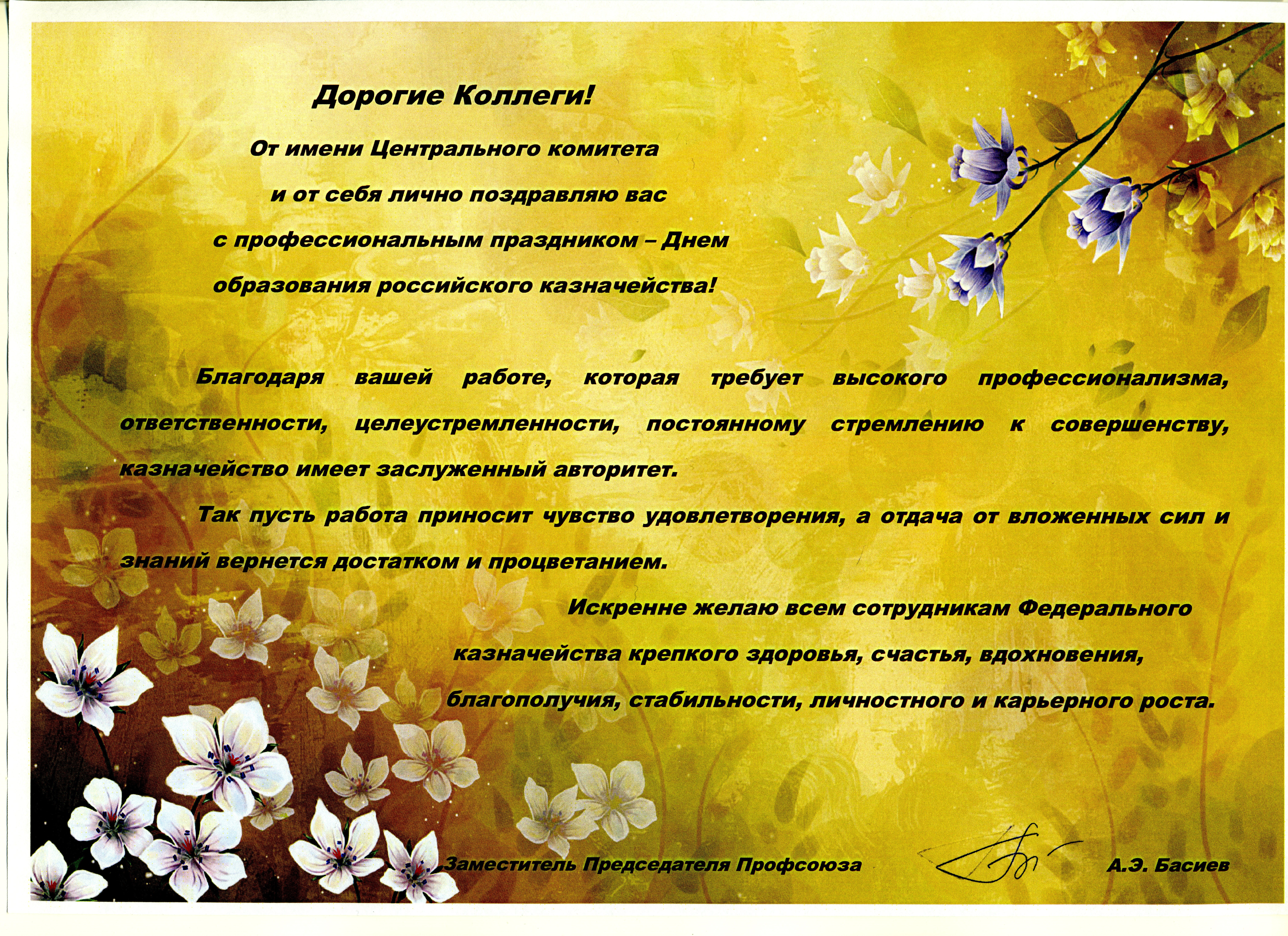 Поздравление заместителя Председателя Профсоюза А.Э. Басиева с Днем образования российского казначейства