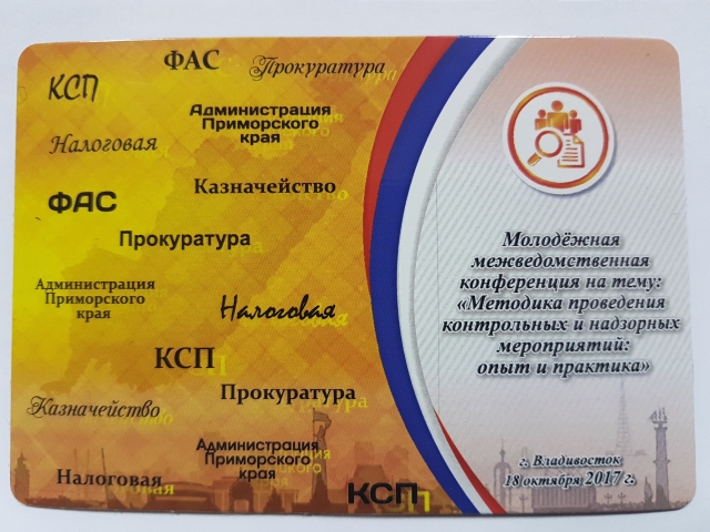 18 октября 2017 г. по инициативе Управления Федерального казначейства по Приморскому краю и при участии контрольно-надзорных органов Приморского края состоялась Молодёжная межведомственная конференция на тему: «Методика проведения контрольных и надзорных мероприятий: опыт и практика», целью которой являлось ознакомление молодых специалистов с деятельностью организаций-участников конференции, обмен опытом в вопросах проведения контрольно-надзорных мероприятий, обсуждение возможностей и методов взаимодействия между этими организациями.