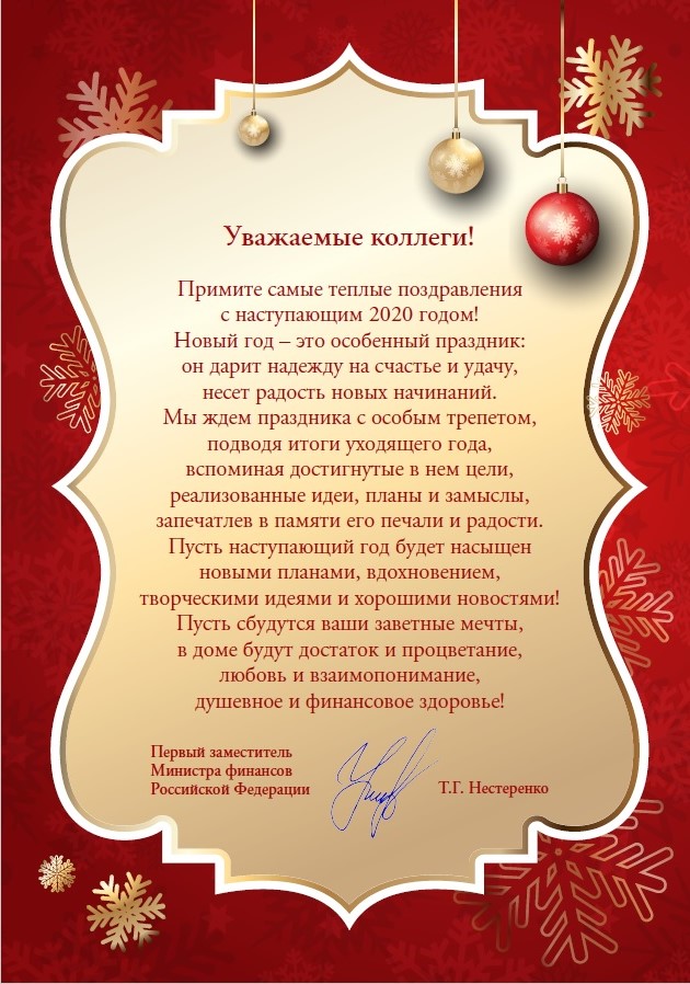 Поздравление Первого заместителя Министра финансов Российской Федерации Т.Г. Нестеренко с наступающим Новым годом!