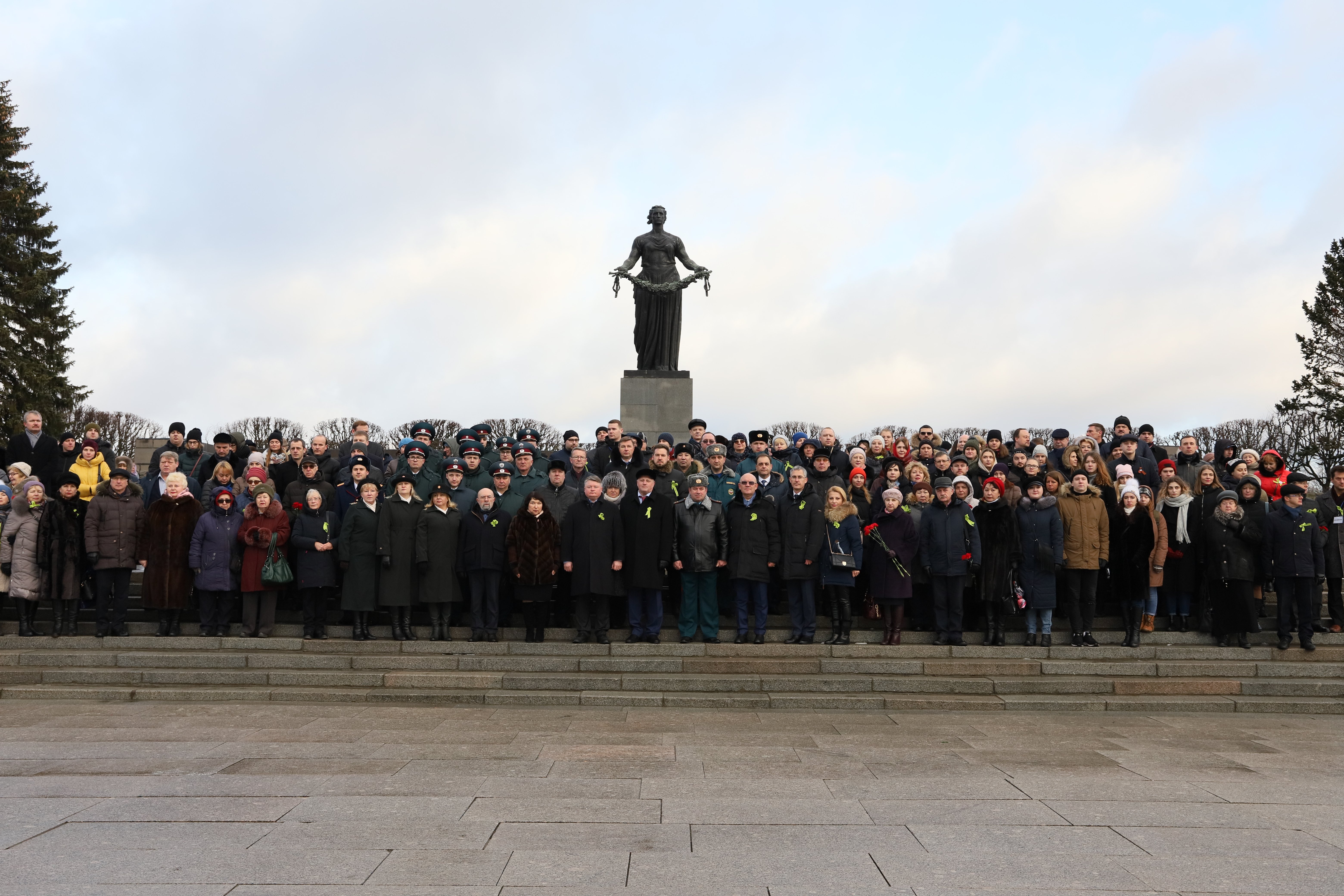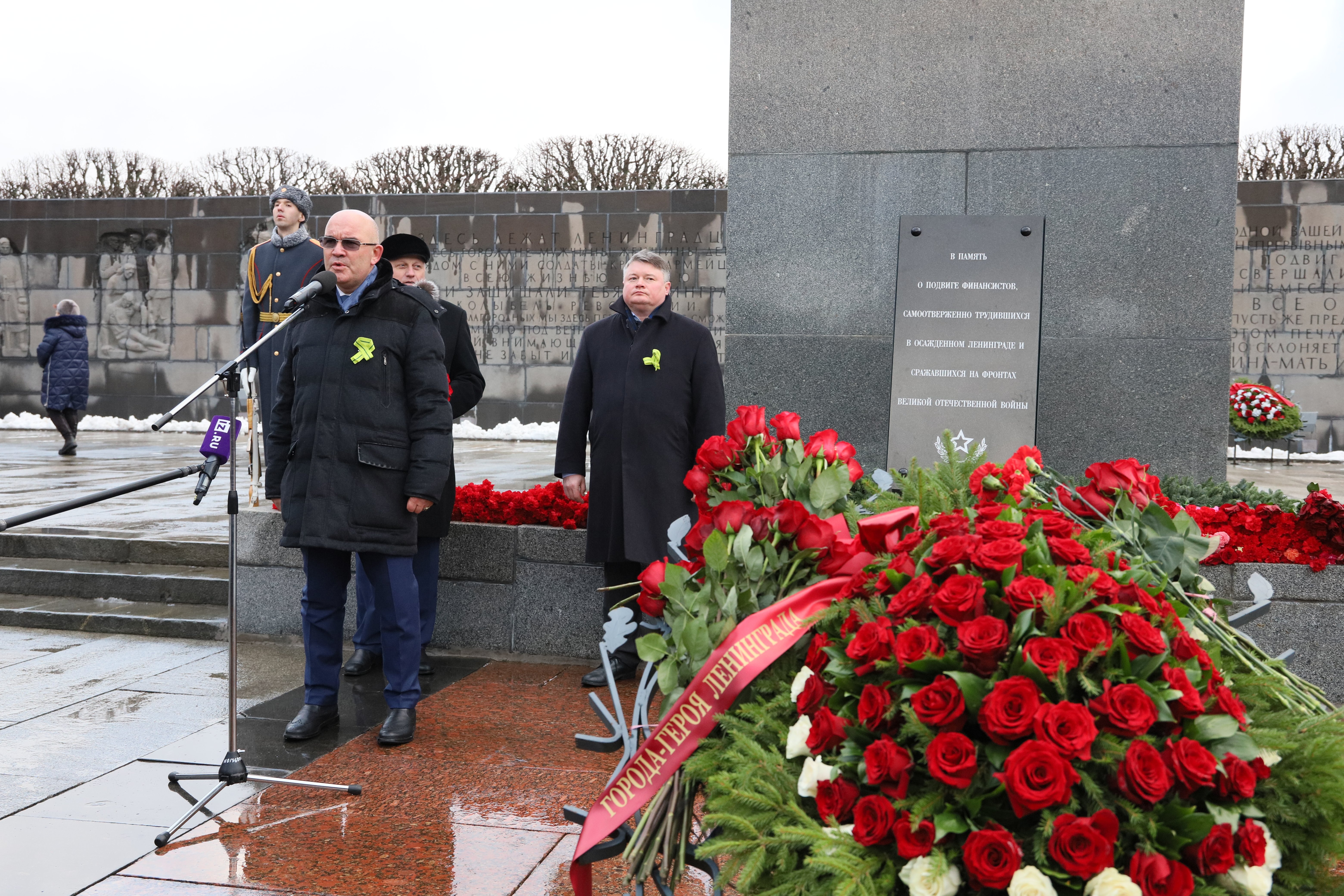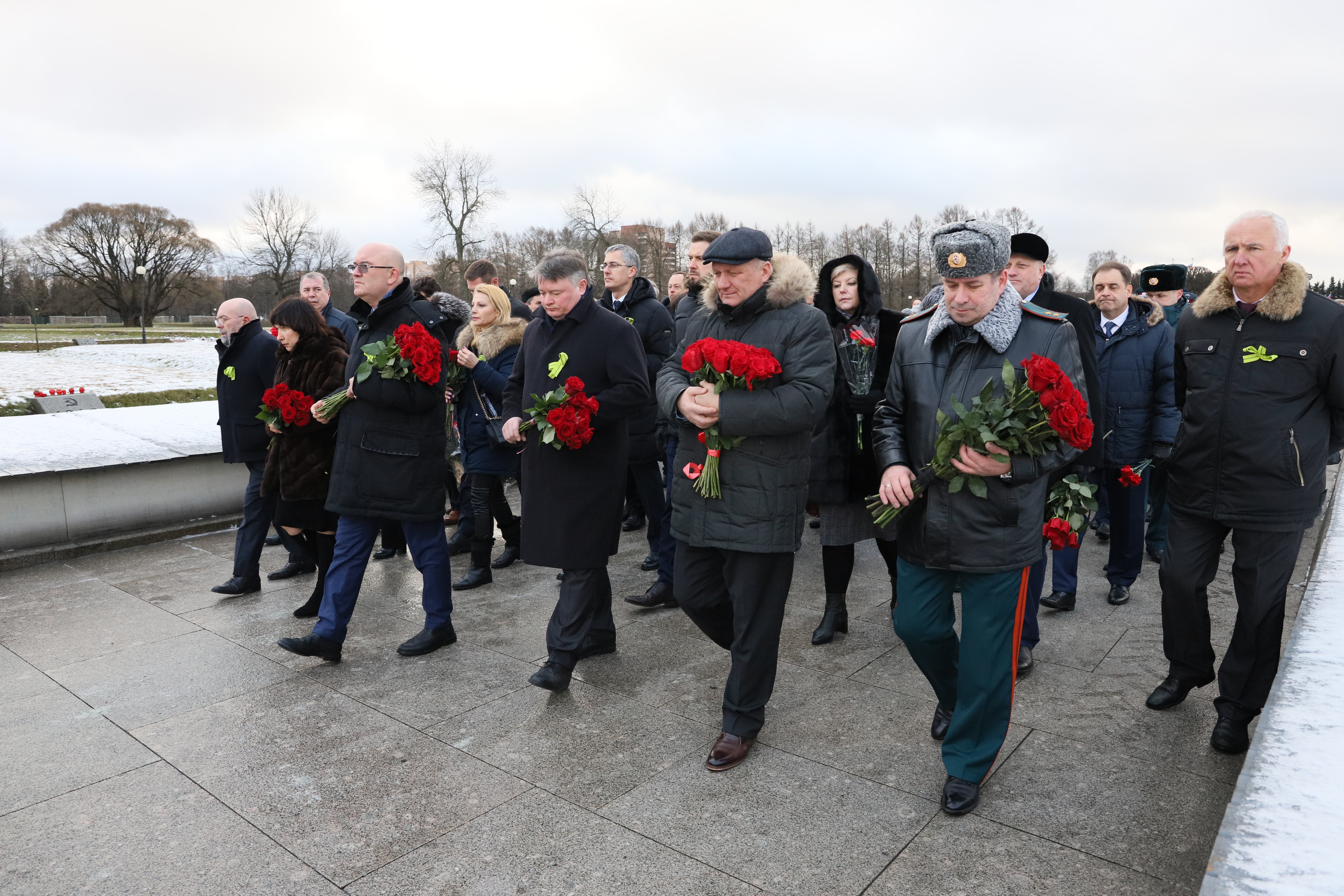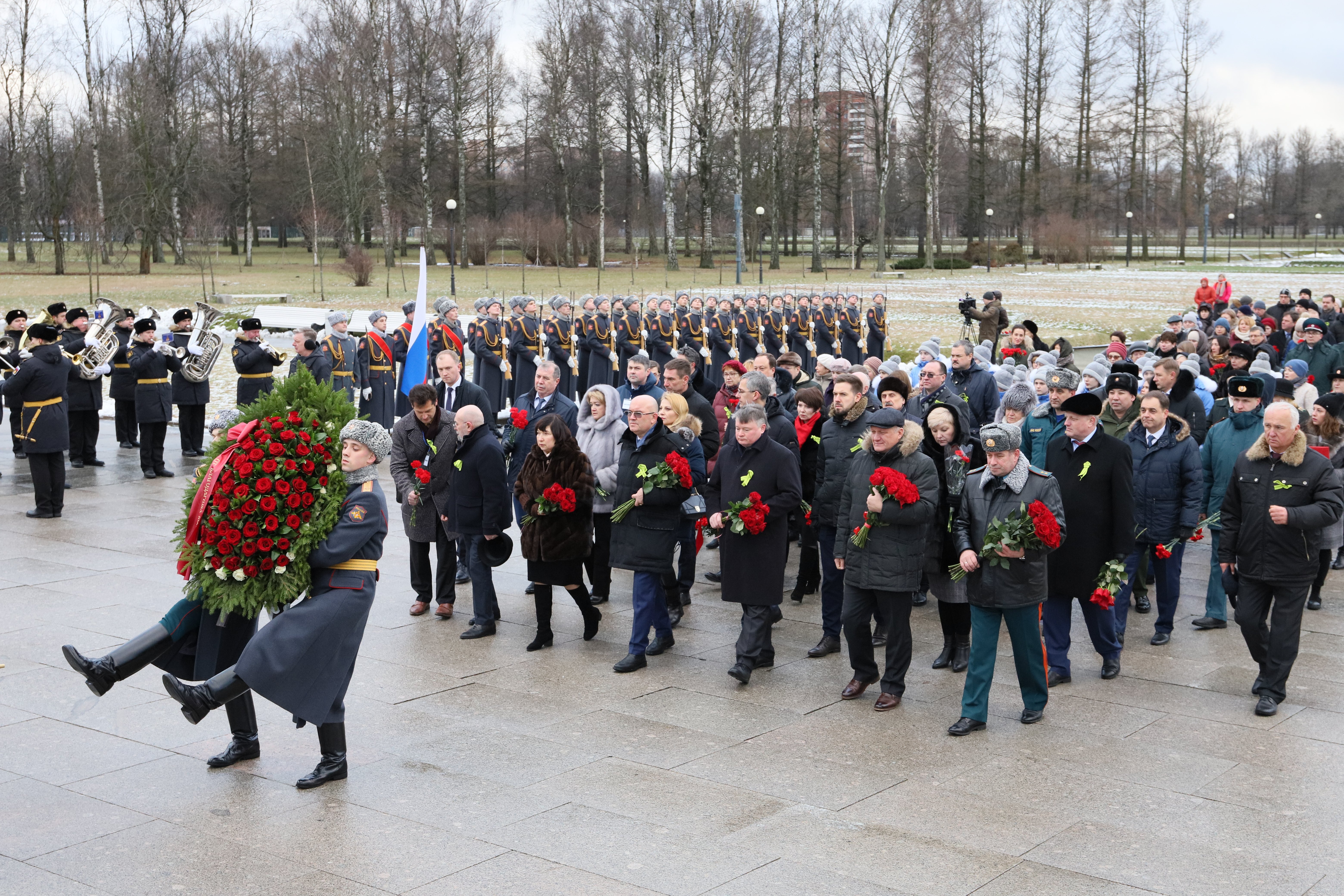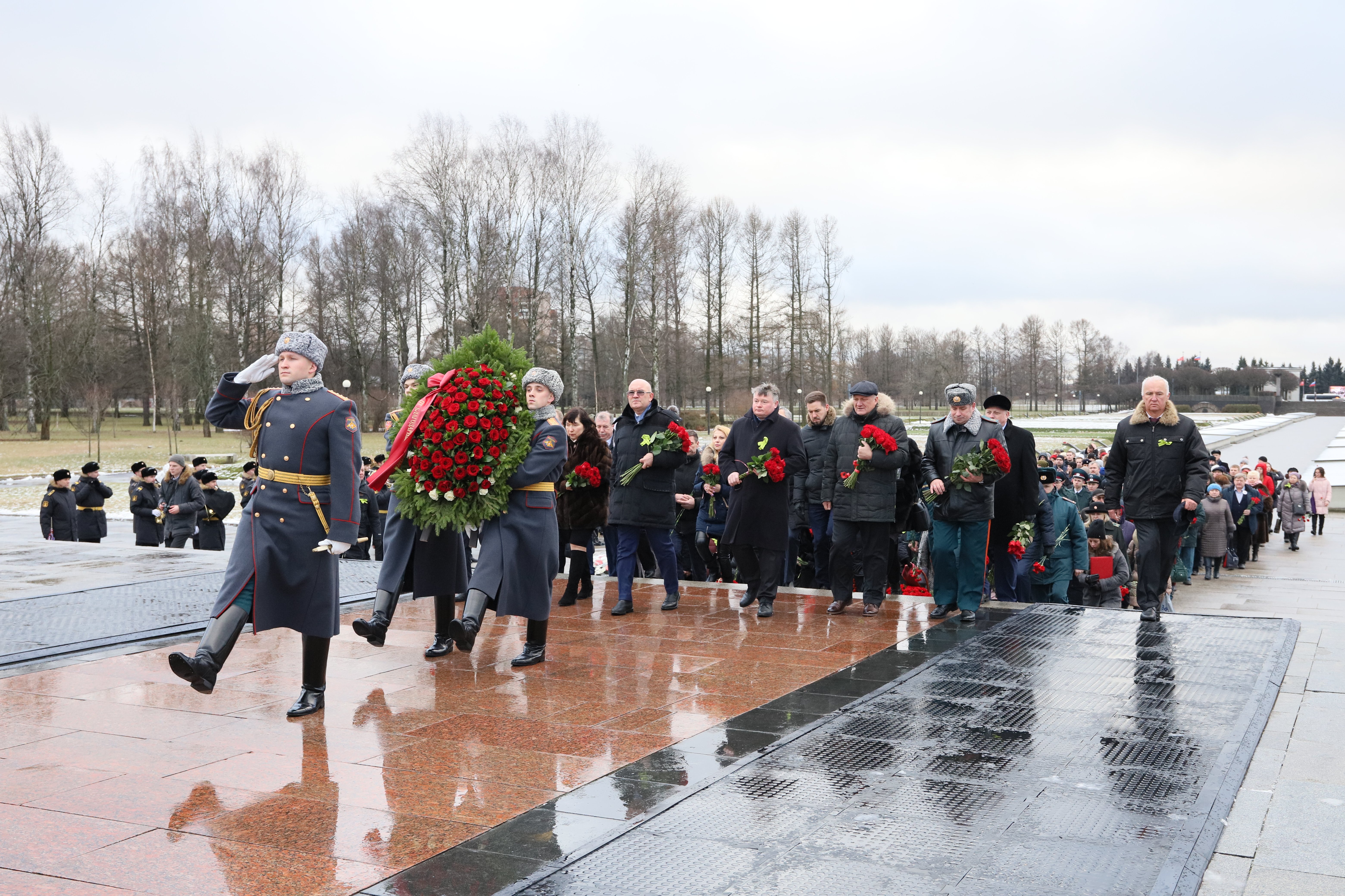 Церемония прошла на Пискаревском кладбище и началась с традиционного возложения венков к монументу Матери-Родины.