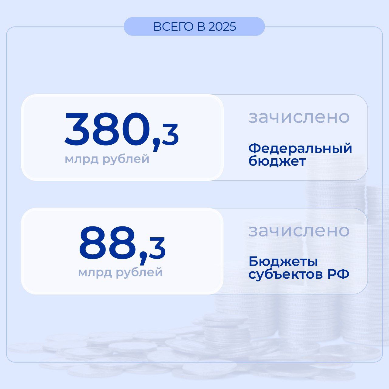 С начала 2025 года в федеральный бюджет зачислено 380,3 млрд рублей, а в бюджеты субъектов РФ — 88,3 млрд рублей.