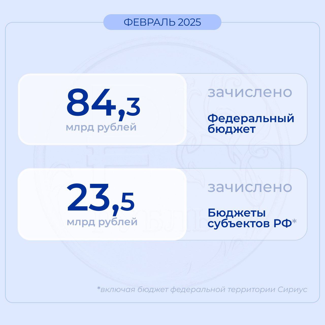 - 84,3 млрд рублей зачислено в федеральный бюджет;