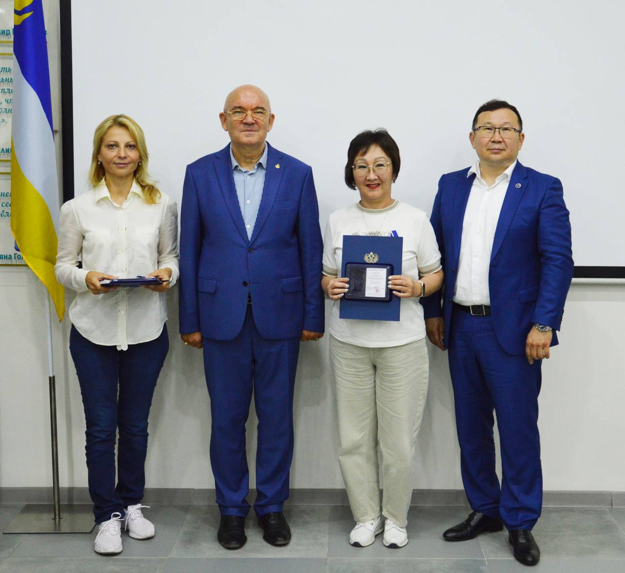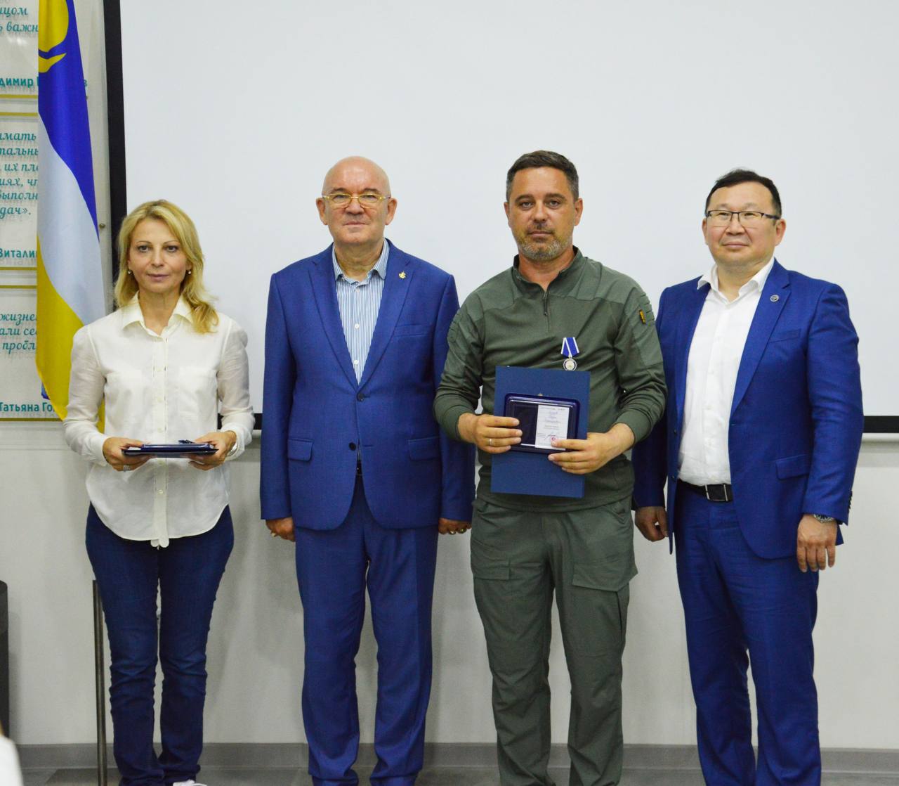 В ходе мероприятия Александр Михайлик поблагодарил сотрудников данного филиала за содействие в решении задач по поддержке участников Специальной военной операции и по патриотическому воспитанию молодежи и, отметив их участие в социально значимых проектах Казначейства России, наградил медалями «За Усердие и Пользу».