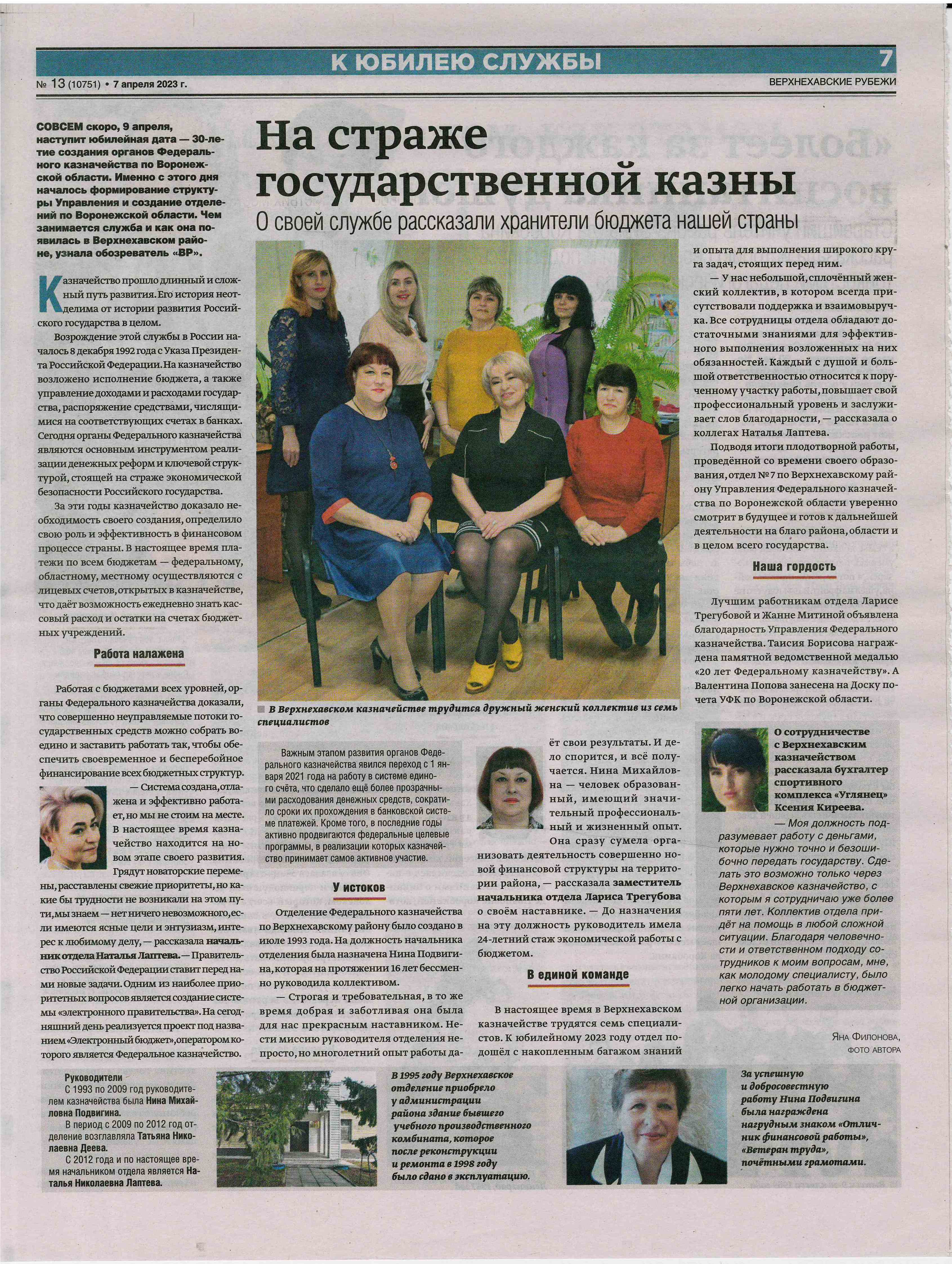 Статья УФК по Воронежской области "На страже государственной казны", газета "Верхнехавские рубежи"